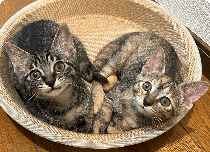 性格:双子ですが、性格は正反対。ごまはおっとりしていて鈍くさく、きなこは気が強くすばしっこいです。いつも予想以上のやんちゃぶりに、頭を抱えています。