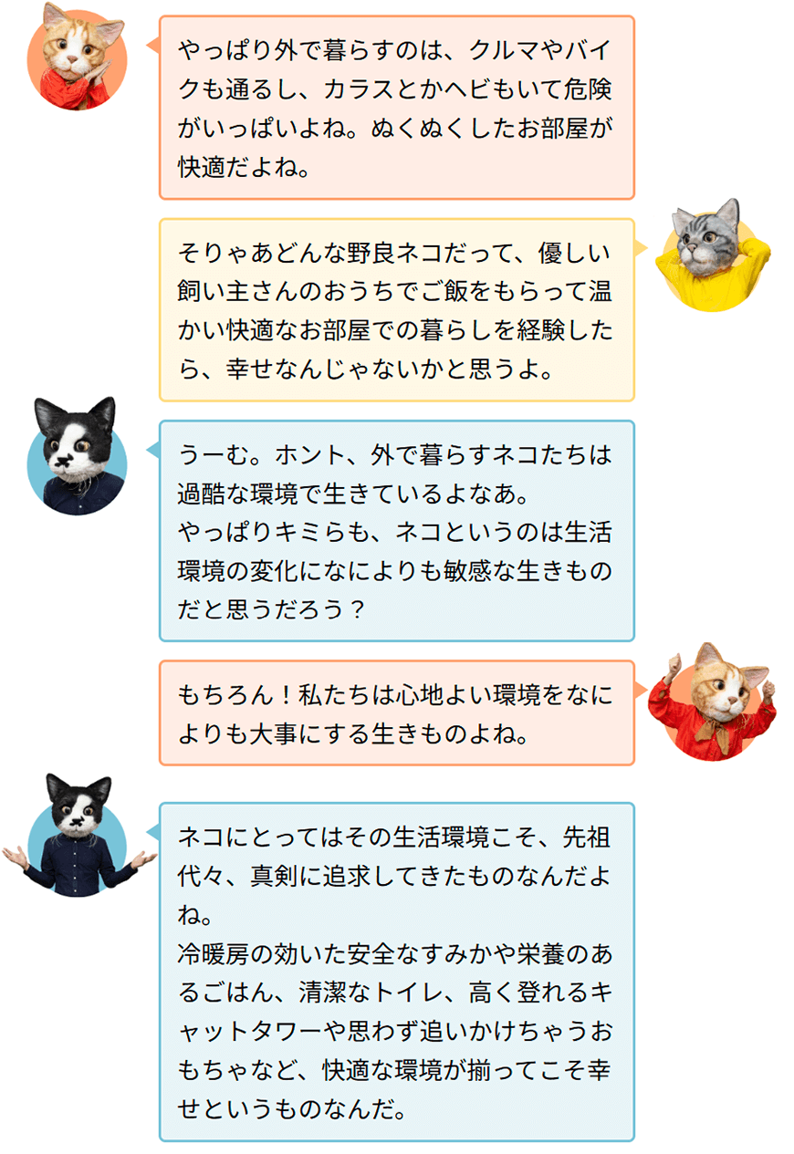 ところで複数のネコたちが顔を突き合わせる「ネコ会議」では、一体どんな話をしているのでしょうか?ここではネコたちが普段感じていることや、話し合っているであろうことをテーマに、座談会形式のコンテンツとしてお届けします。