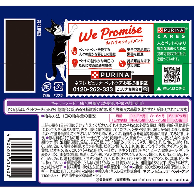 やわらかくほぐしたお魚やお肉のうまみをジューシーなゼリーで包み込んだごはん。1歳までの子ねこが食べやすい小さめフレーク。ツナ・チキンの2種類が入ったバラエティパックで飽きることなくネコさん大満足!