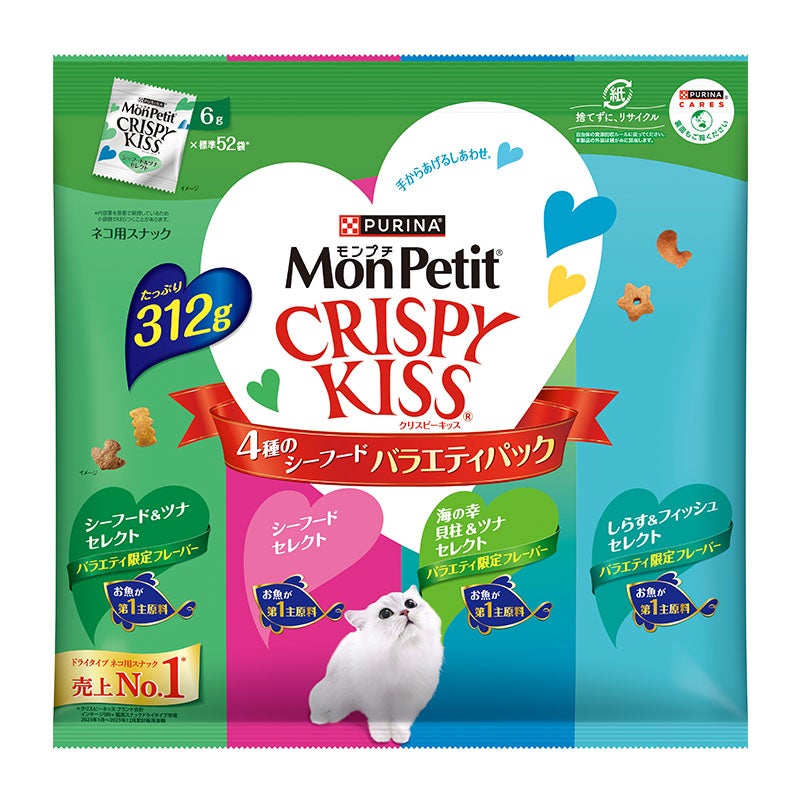 白身魚、チキン、米、チキンミール、牛脂、えんどう豆でんぷん、大麦、コーングルテン、たんぱく加水分解物、キャッサバ粉、モルトエキス、ぶどう糖、酵母、ツナパウダー、えびパウダー、かにパウダー、ミネラル類(カルシウム、カリウム、ナトリウム、クロライド、鉄、銅、マンガン、亜鉛、ヨウ素、セレン)、酸味料、アミノ酸類(グリシン、タウリン)、ビタミン類(A、D、E、K、B1、B2、パントテン酸、ナイアシン、B6、葉酸、ビオチン、B12、コリン、C)、着色料(食用赤色40号、食用青色2号、食用黄色4号、食用黄色5号)、酸化防止剤(ブチルヒドロキシアニソール、ジブチルヒドロキシトルエン、ミックストコフェロール)