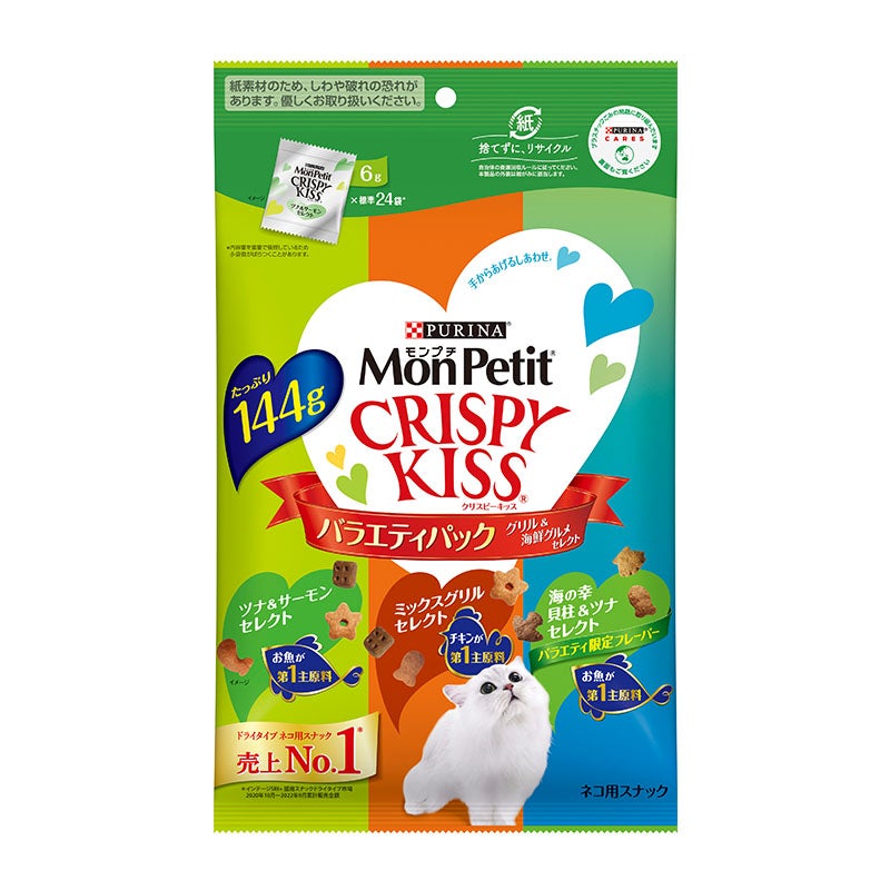 白身魚、チキン、米、チキンミール、牛脂、えんどう豆でんぷん、大麦、コーングルテン、たんぱく加水分解物、キャッサバ粉、モルトエキス、サーモンパウダー、ぶどう糖、酵母、ツナパウダー、えびパウダー、かにパウダー、ミネラル類(カルシウム、カリウム、ナトリウム、クロライド、鉄、銅、マンガン、亜鉛、ヨウ素、セレン)、酸味料、アミノ酸類(グリシン、タウリン)、ビタミン類(A、D、E、K、B1、B2、パントテン酸、ナイアシン、B6、葉酸、ビオチン、B12、コリン、C)、着色料(食用赤色40号、食用青色2号、食用黄色4号、食用黄色5号)、酸化防止剤(ブチルヒドロキシアニソール、ジブチルヒドロキシトルエン、ミックストコフェロール)