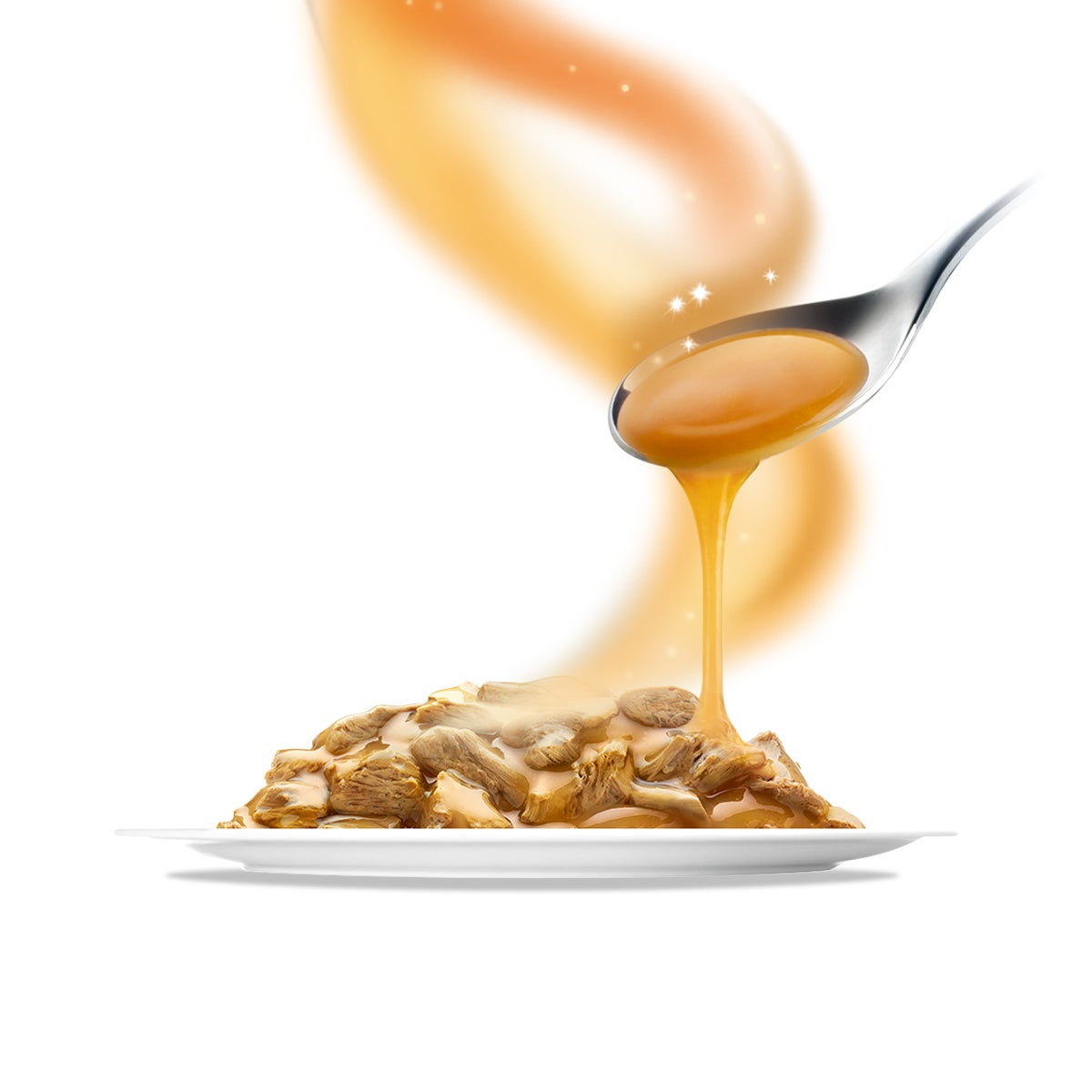 1歳までの子ねこが食べやすい小さめフレーク。やわらかくほぐしたチキンのうまみをジューシーなゼリーで包み込んだごはん。