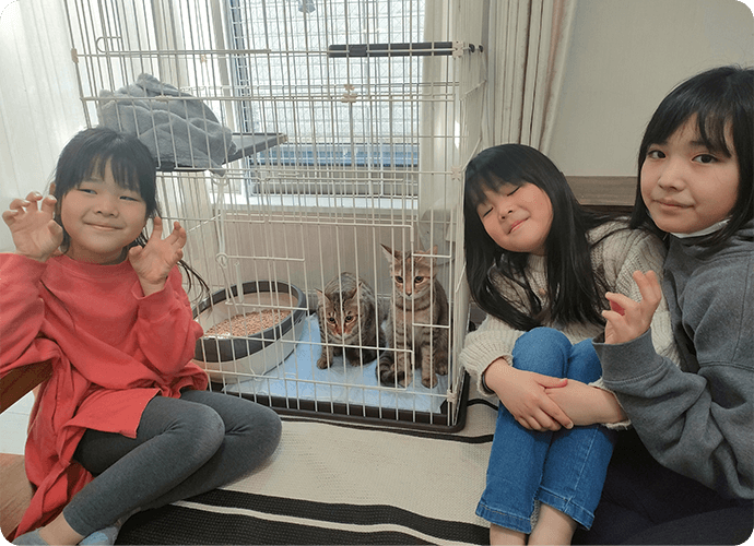 まず見た目のインパクトが強く、子供たちも毎回“かわいい”ということで猫好きにはたまらないようです。内部に入るときにはしっかりと消毒や出ていかないような配慮がなされていることや、スタッフの方の説明も丁寧で、猫の様子や個々の性格にあわせて見せていただいたり、触らせていただいたり、抱っこさせていただいたりして活動自体にとても安心感がわき、楽しい時間を過ごさせていただきました。。