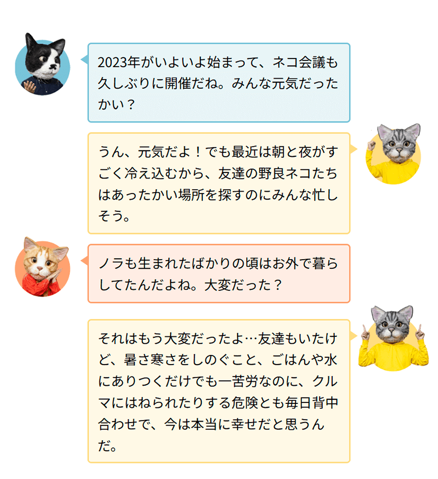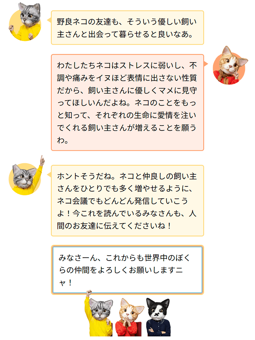 ところで複数のネコたちが顔を突き合わせる「ネコ会議」では、一体どんな話をしているのでしょうか?ここではネコたちが普段感じていることや、話し合っているであろうことをテーマに、座談会形式のコンテンツとしてお届けします。